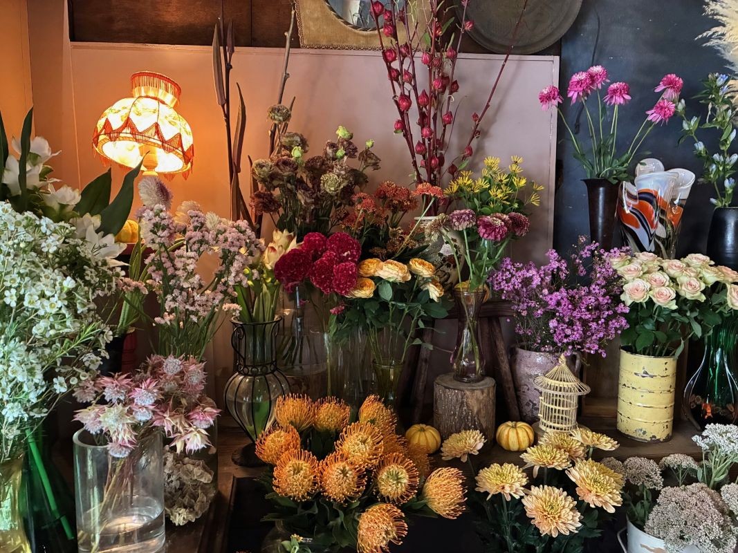 窓から差す光の角度で、花々が落ち着いた色に変化して見えます。そして、花の種類や色が多彩で、どこから見ても絵画のようで色彩のセンスを感じます。