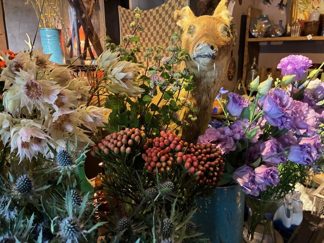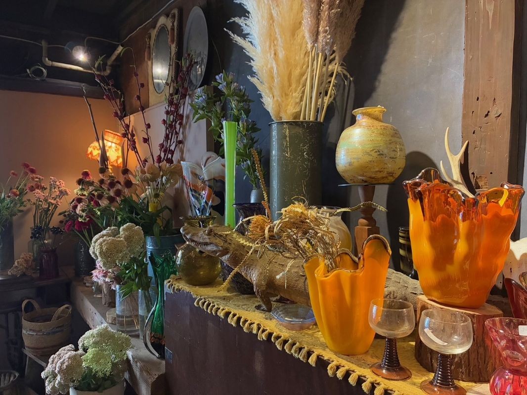 はく製や海外のビンテージの物が常に生活の中にある環境で育ったこともあり、店内には花の他にも北尾さんセレクトの洗練されたきたビンテージの花瓶や小物がたくさんあります。