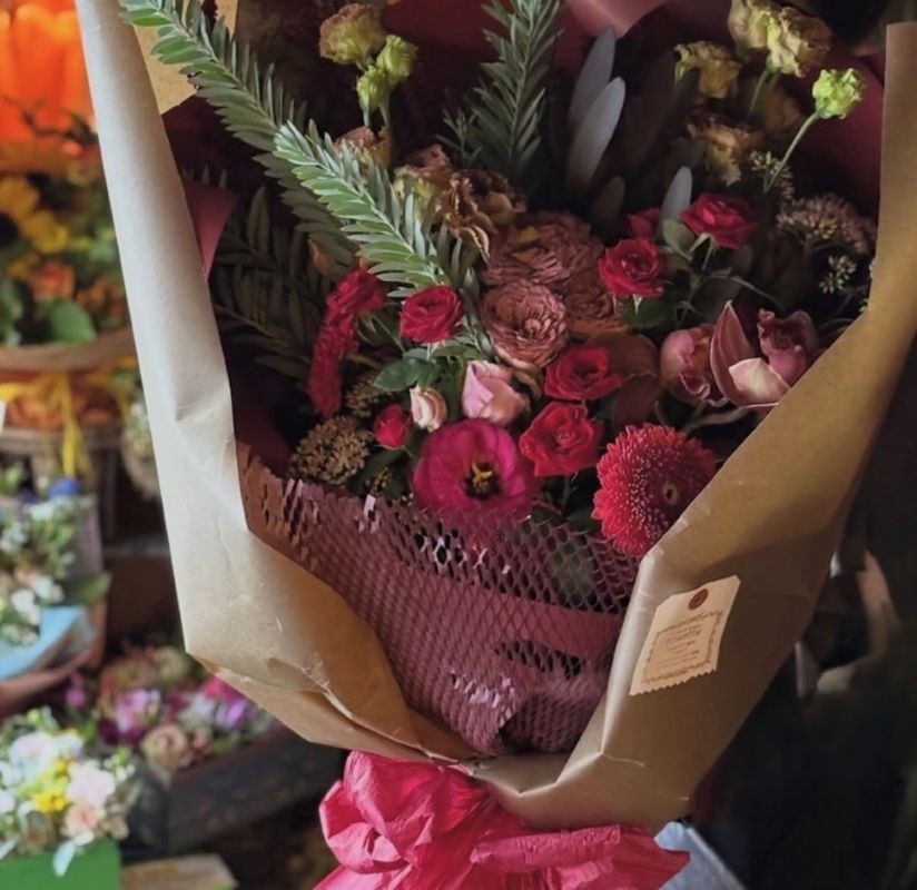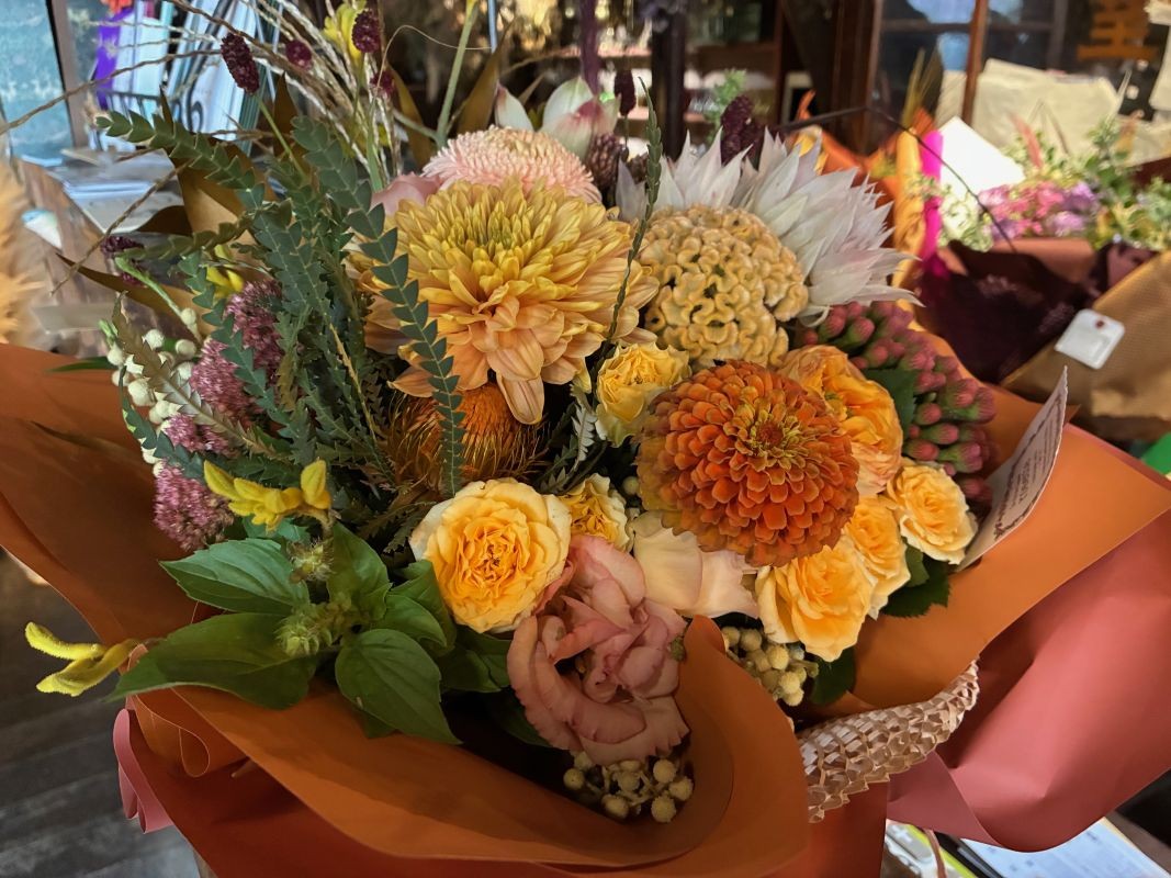 また、花束にはアンティークピンクの大輪のローズや深いボルドーのスプレーバラ、モカブラウンのシンビジウムやグリーンからモーブベージュに変化するトルコキキョウ、チョコレート色のリューカデンドロンなどのクラシカルな色合いの物や、色とりどりの多くの種類の花がありました。