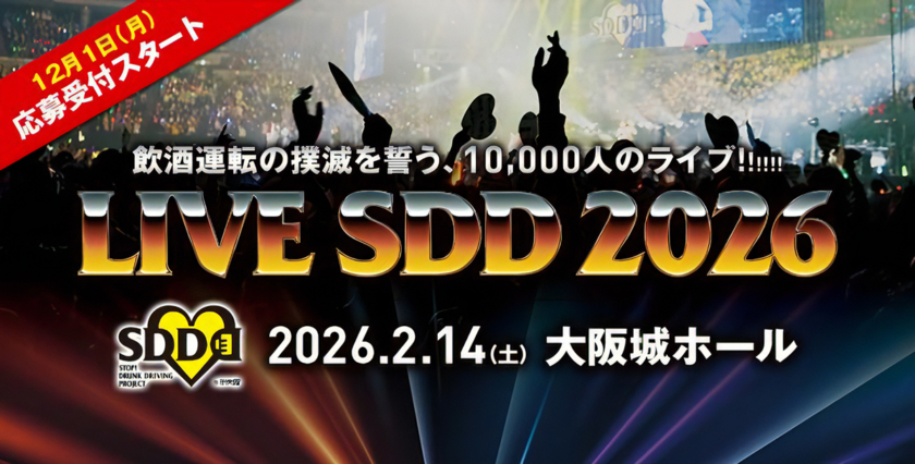 大阪城ホール(大阪市中央区)で2026年2月14日、FM大阪による飲酒運転撲滅プロジェクトのライブイベント「LIVE SDD 2026」が開かれる。9月30日、出演アーティストが発表された。