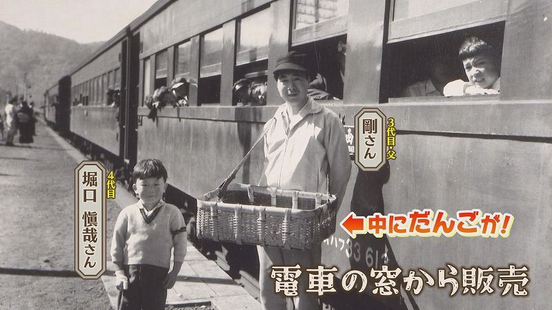 4代目 堀口 愼哉さん:「初代の奥さんが新潟出身で、新潟は米どころで大沼で団子を作ろうかとなった。列車を降りる人には店で団子を売っていたが、降りない人には駅弁としてホームで団子を買ってもらっていた。カゴで、団子を駅弁のように売りやすくするために、串団子じゃなくて平べったい団子。お弁当みたいな形で売るように」