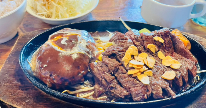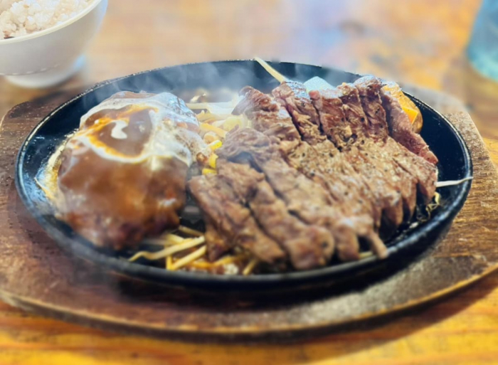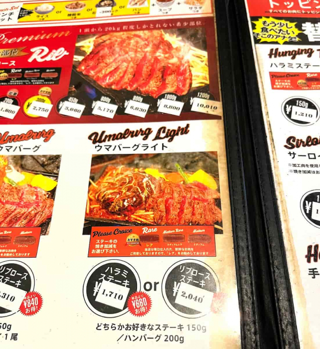 一番人気は「ウマバーグ」。200gのハンバーグにエビフライ一尾、そしてリブかハラミのステーキを選べる豪華セットです。ボリュームがすごいため、私はエビフライなしの「ウマバーグライト」をチョイス。ステーキはハラミをチョイスして、お肉が柔らかく食べられるという、お店おすすめのレア焼きでお願いしました。