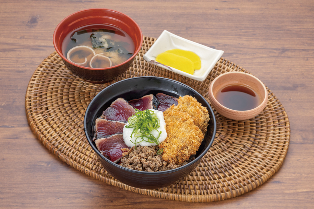 かつお3種丼 950円。注文が入ってから藁で焼き上げる豪快なカツオのたたきが自慢。