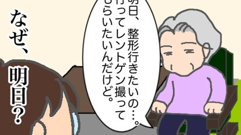 まる子さんがいつものように部屋へ行くと、義母から「明日、整形外科に行きたい」と言われました。明日は週末で、社会人や学生で混み合いそうな上、医師も交代制のため、「今日じゃダメなのか」と聞きましたが、まる子さんが仕事なのを理由に明日がいいと言い張ります。しかし、仕事から帰ったまる子さんは、明日がデイケアの日だということに気付いてしまい、義母が整形外科に行く日を「明日」と言っていたのは、デイケアを休むためだったのかとあきれました。