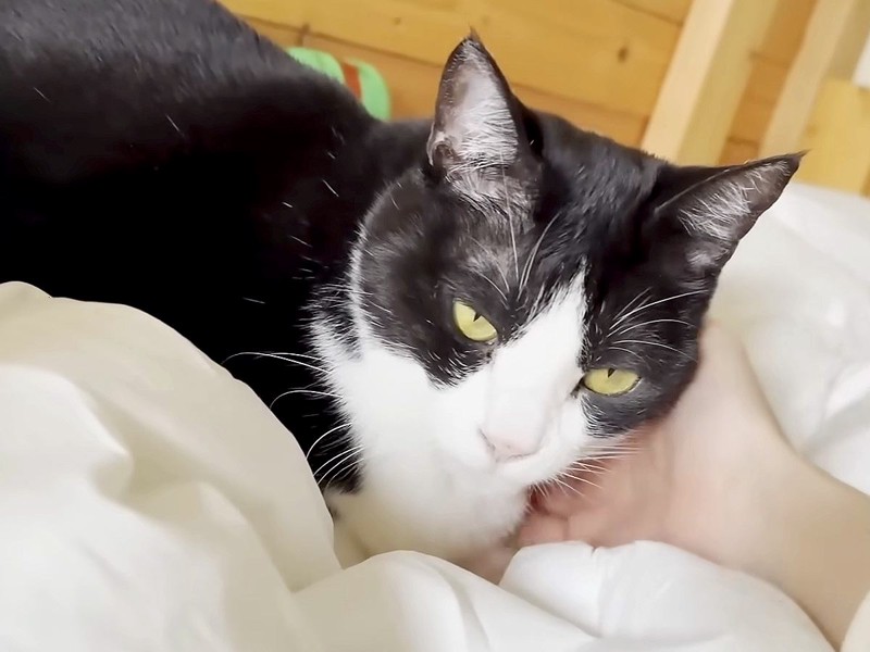 動画中盤には、日没後、お部屋に集うニャンズの様子も。室内に配置された2台ベッドのうち、1台ではひまわりちゃん・おでこちゃん母子が、もう1台の上では秀吉くん・豆大福くんがぴたりと身を寄せ合っていたそう。それぞれのペアによる愛らしい“猫団子”もまた、多くの視聴者を魅了しました。