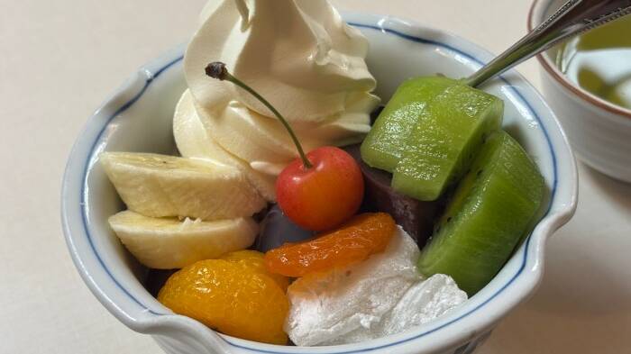 ぶぶあられ、ホイップクリーム、ふやき、粒あん、みたらし串だんご、バニラアイス、特製黒蜜、天草入り寒天と、ほうじ茶を組み合わせた特製あんみつ。