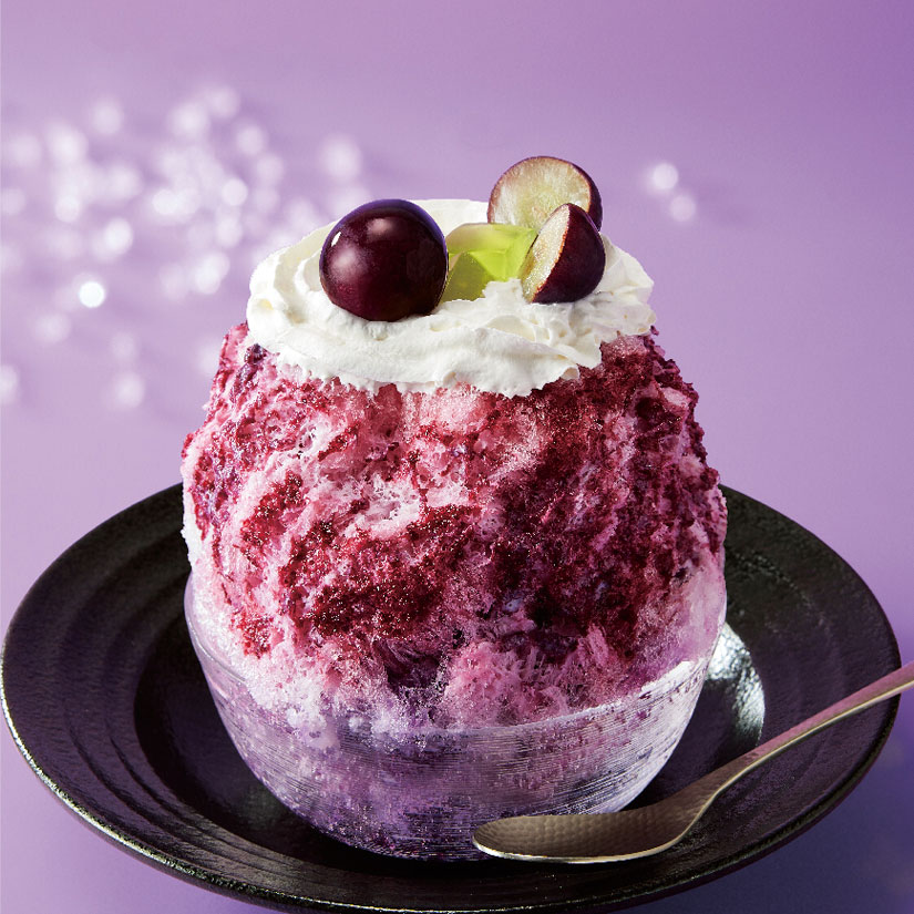 ナガノパープルソースと果皮入りのソースと黒葡萄とマスカットゼリーをのせた削り氷。