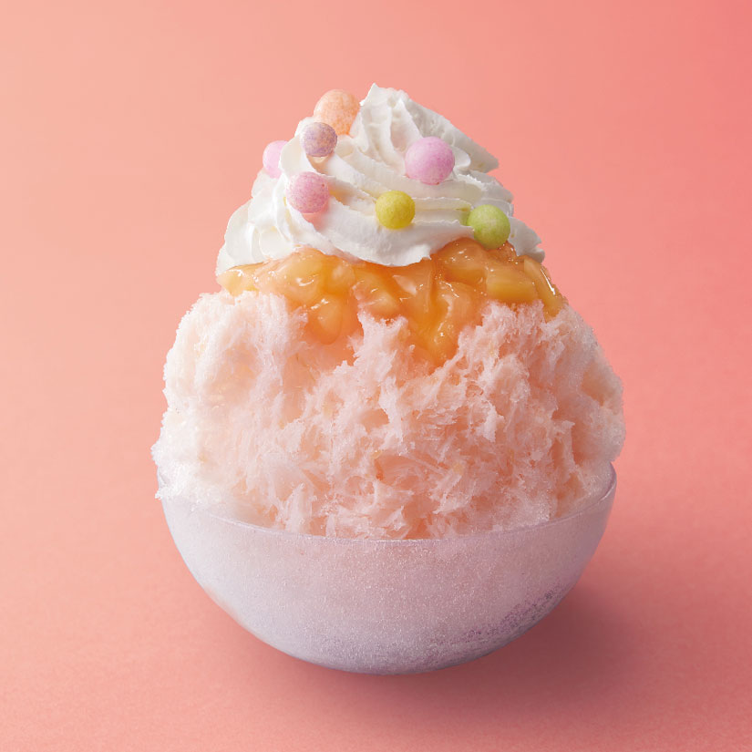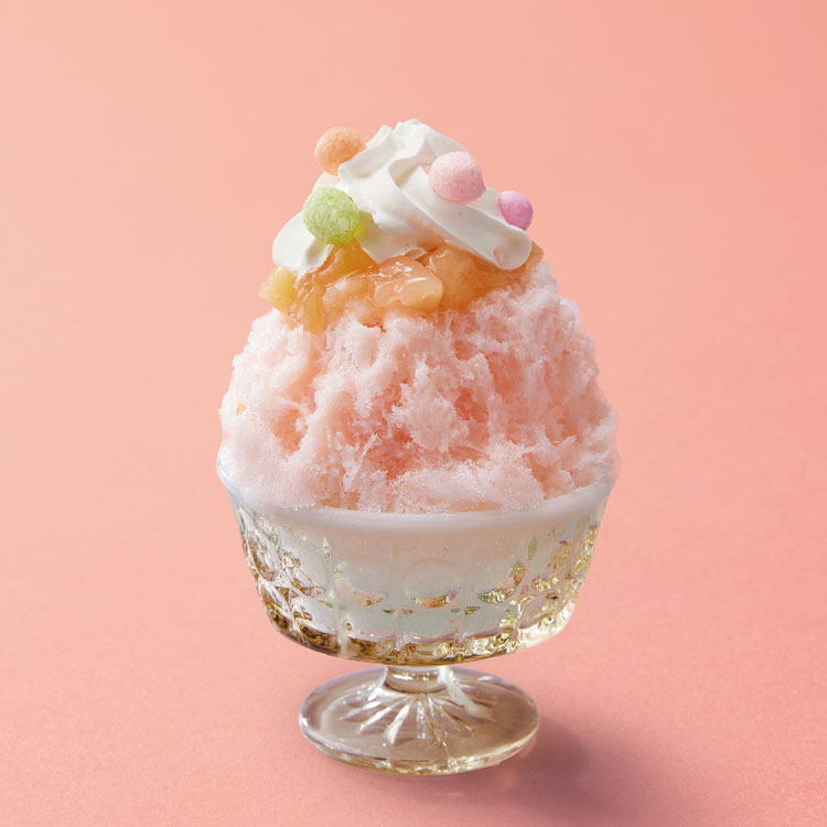 信州産みるくソース入りの桃ソースと、桃の果肉とホイップを組み合わせた削り氷。