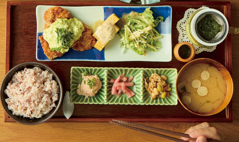 和風ハンバーグ・さばの味噌煮などの定食スタイルに加え、主菜と野菜をバランスよく盛り付けたローストビーフやまぐろのサラダごはん、お茶漬け、京都産100%で抹茶の原料となるてん茶と厳選小麦で作る生パスタを使ったメニューなどがそろいます。