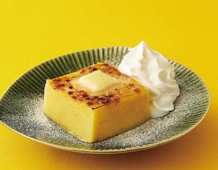 さつまいもの優しい甘さが広がる芋ようかんに、和三盆糖をのせて焼き、バターで仕上げた一品。