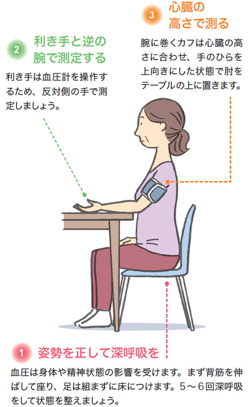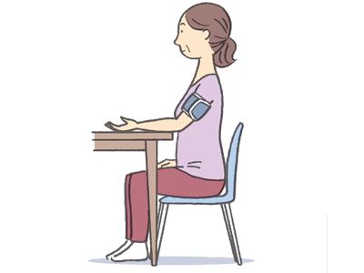 血圧は身体や精神状態の影響を受けます。まず背筋を伸ばして座り、足は組まずに床につけます。5 〜 6回深呼吸をして状態を整えましょう。