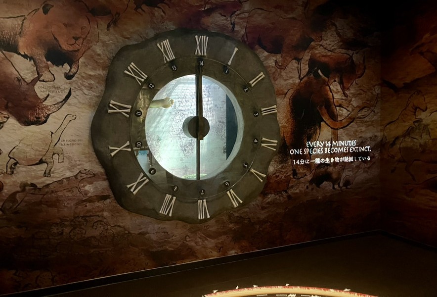 ここは絶滅・進化を表す時計とアジアアロワナが泳ぐ水槽が一体になっており、「Message」という名前通り、メッセージ性の強いエリアとなっています。