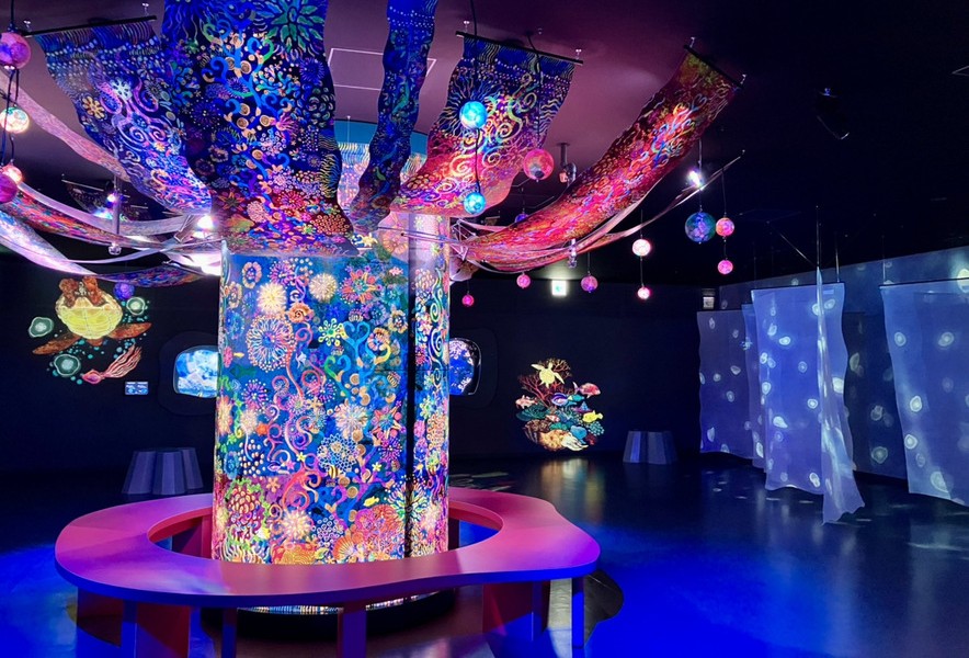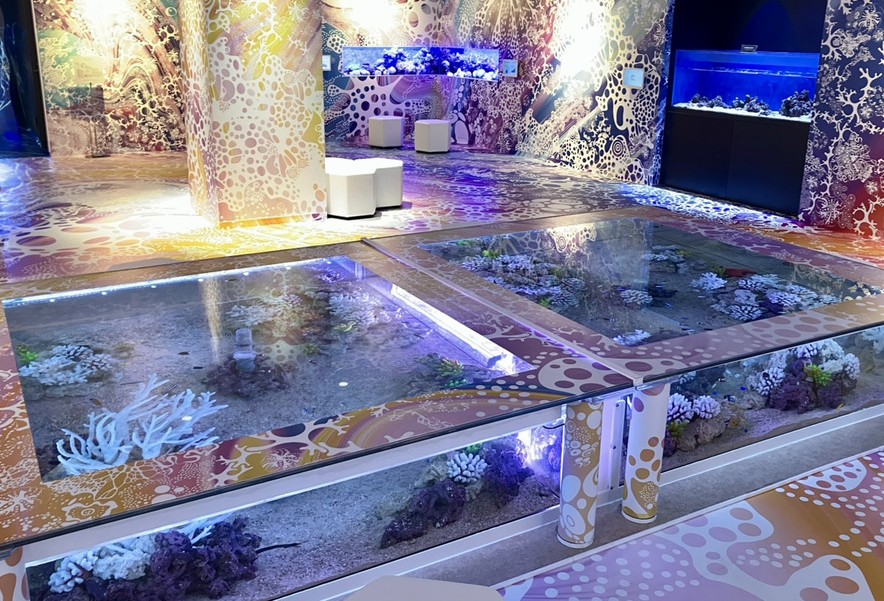 「展示エリア5 Coral 色彩のシーン」は、サンゴ礁を思わせるラッピングで全体が包まれているエリア。入ってすぐのところにある四角形の水槽では、椅子に座って上から魚を眺めたり、横からサンゴ礁をじっくり観察したりすることができます。