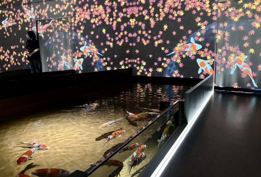 金色の部屋で、優雅に泳ぐヒレナガゴイや金魚たち。2026年3月31日までの期間限定で展示されている、毛利元就の甲冑(レプリカ)と魚のコラボレーションが見どころの「展示エリア7 Zipangu 黄金のシーン」。
