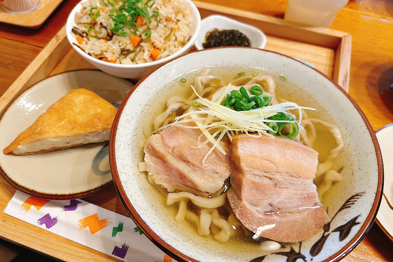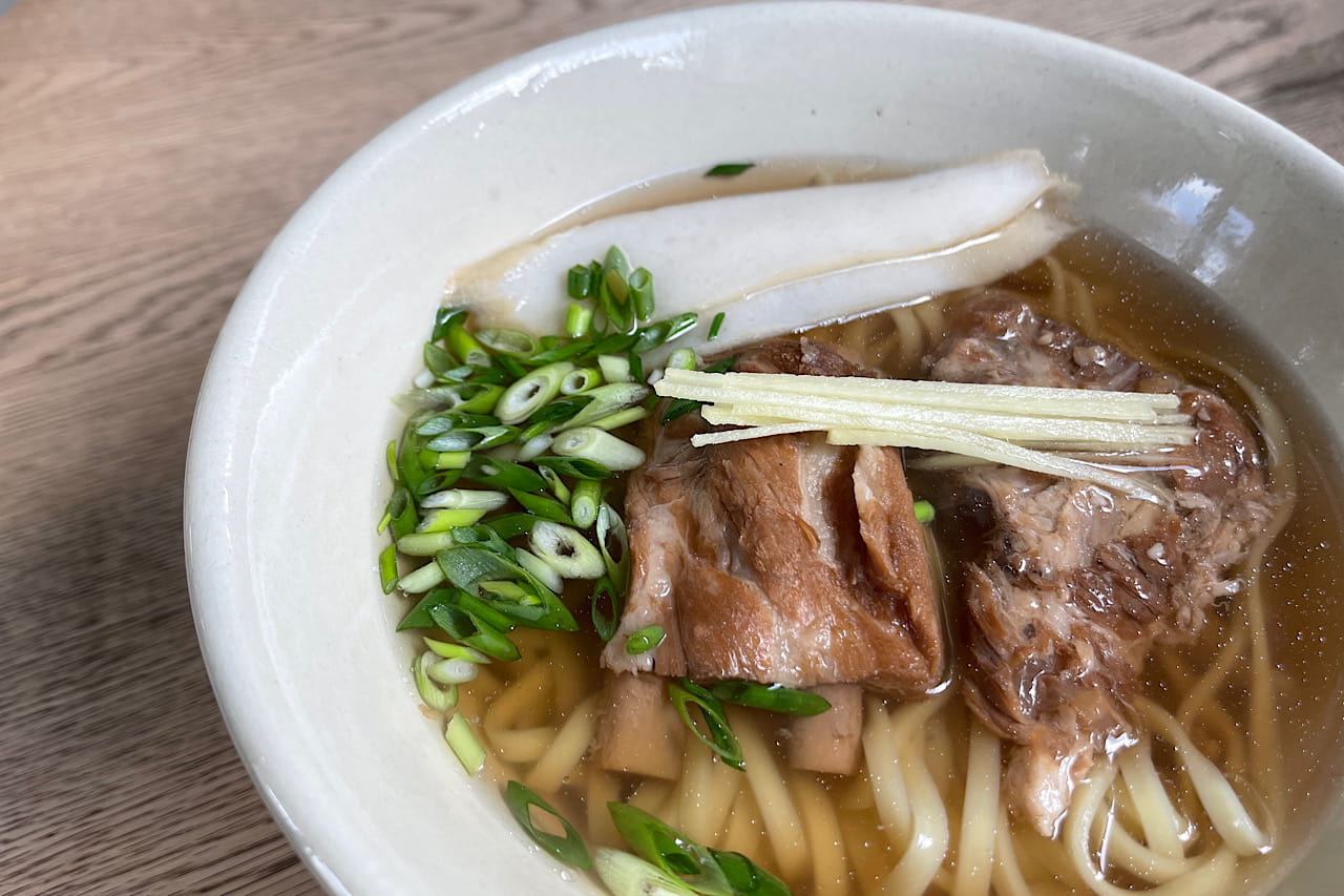 那覇・浮島通りにある「沖縄そばの店 浮島BASE」は、つるもち食感の生麺と、だしの効いたスープが評判の人気店。豚骨と鰹の合わせだしはあっさりしながらも奥深く、毎日でも食べたくなる味です。 定番の「なんこつそば」はトロトロに煮込まれた軟骨ソーキが主役。沖縄そばだけでなく、ナーベラーやゴーヤーなどのちゃんぷるー定食も充実しています。古民家を改装した落ち着いた空間で、地元の人にも観光客にも愛される一軒です。 住所:〒900-0014 沖縄県那覇市松尾2丁目12-2