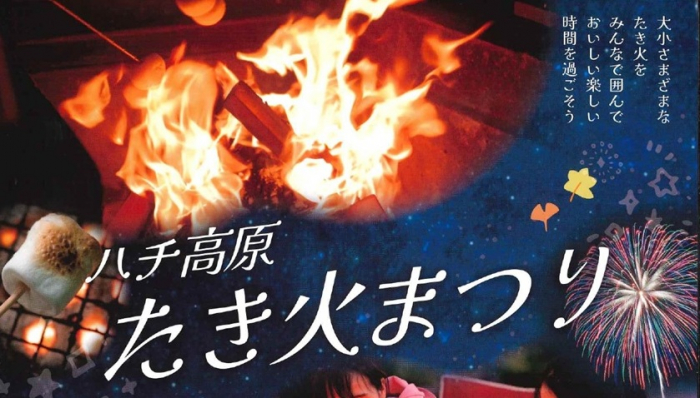 「ハチ高原たき火まつり」では、たき火ブースや星空散歩、焼きマシュマロ体験が楽しめます。たき火台のレンタルや薪の販売があり、手ぶらでも参加可能です。宿泊者限定の特典も用意されています。