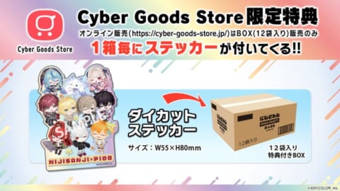 「Cyber Goods Store」にてオンライン販売が行われます。Cyber Goods Storeでは、カートン販売(1箱12袋入)のみとなっており、1箱購入ごとに限定特典のダイカットステッカーが1枚プレゼントされます。この特典も配布数に限りがあり、なくなり次第終了となります。購入特典はランダムでの配布となる場合がありますので、あらかじめご了承ください。