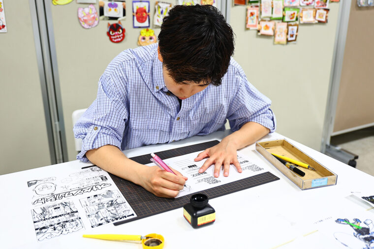 その後、つけペンで描き出した個性的なキャラクターで一同を驚かせた樋浦さん。