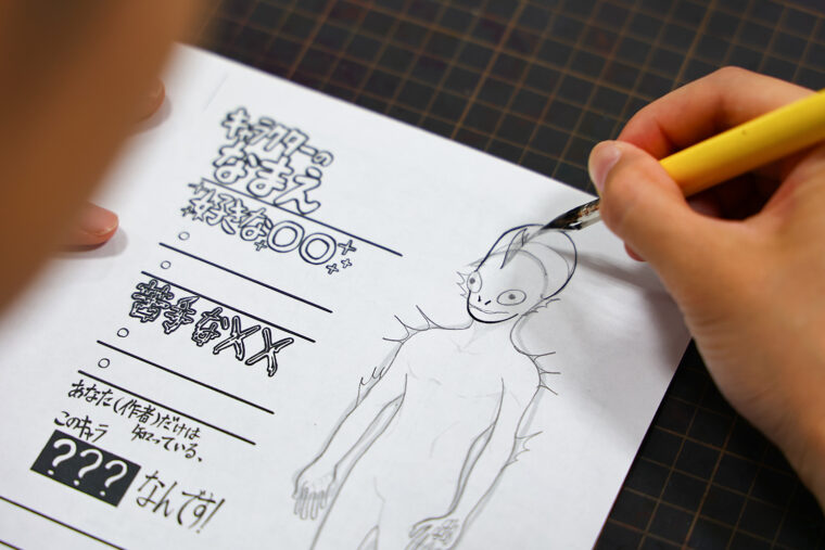 続いては、人物像を想定しながら、線だけの人型を下地に、オリジナルのキャラクターを描いていく工程にチャレンジ。