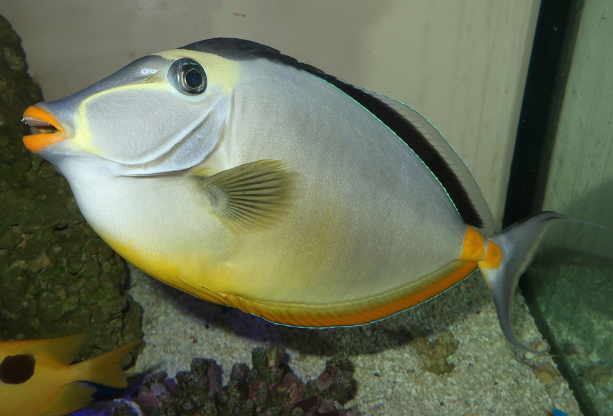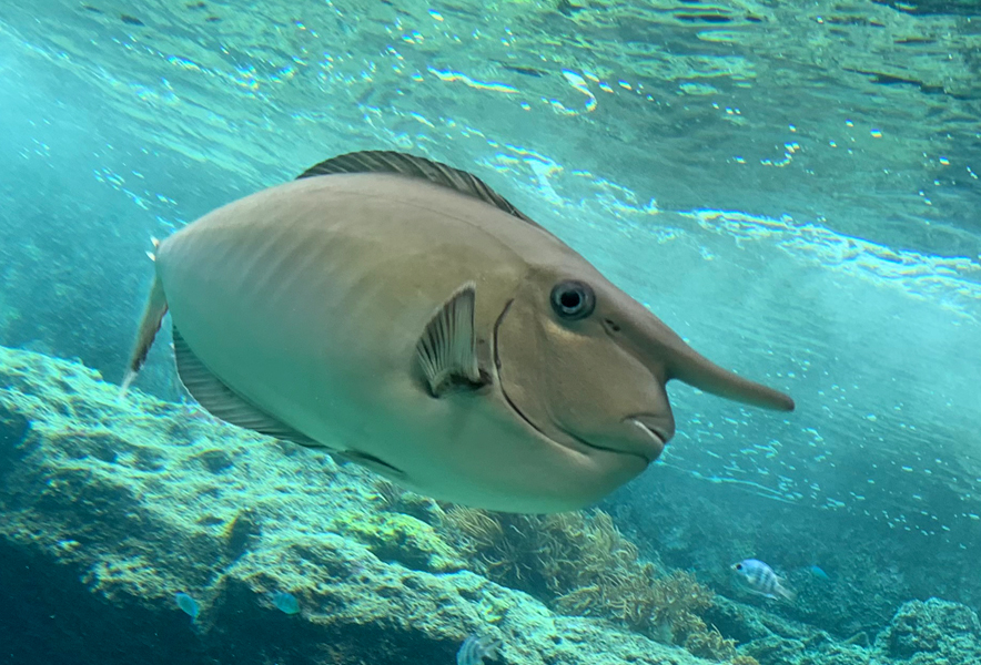 一方、水族館では吻がのびるテングハギ属の魚がいろいろ飼育され、人気の魚となっています。大きい水槽をゆったり泳ぐテングハギ属の魚は格好よく、ぜひとも水族館でその様子を見てほしいものです。