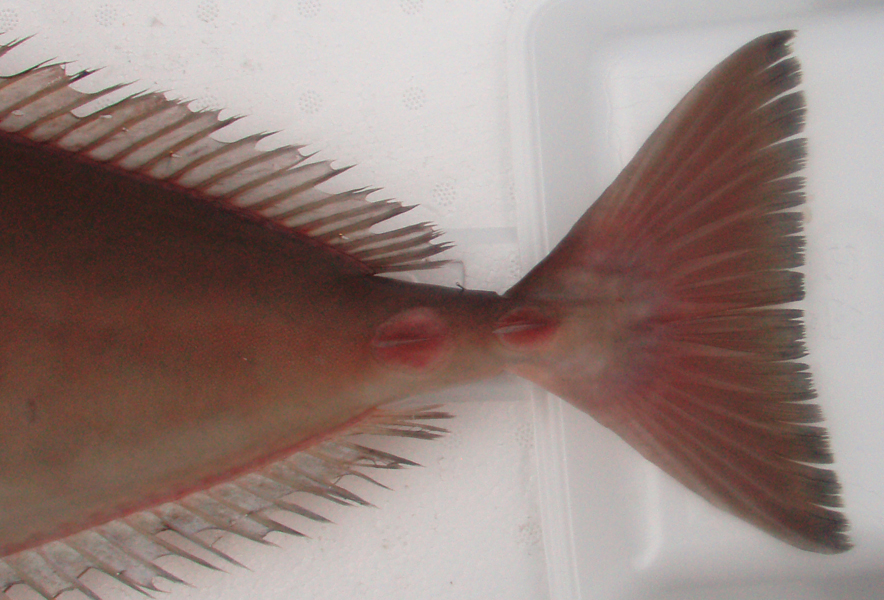 このほかの特徴としてテングハギ属の魚は尾柄部に、大きな2対の骨質板を有しているのも特徴的です(ただしボウズハギなどでは1対)。なお、ニザダイではこの骨質板が3~5対あり、クロハギ属、サザナミハギ属およびヒレナガハギ属では尾柄部におりたたむことができる棘が1対あります。