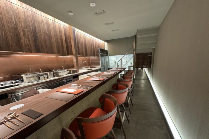 奥に進むと、6席だけのカウンター席が登場します。ウォルナットの無垢材を贅沢に使用していて、高級なBarやフレンチのような雰囲気です。