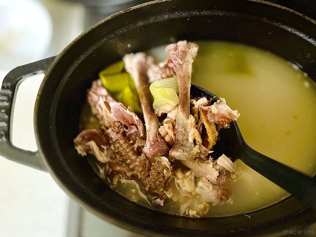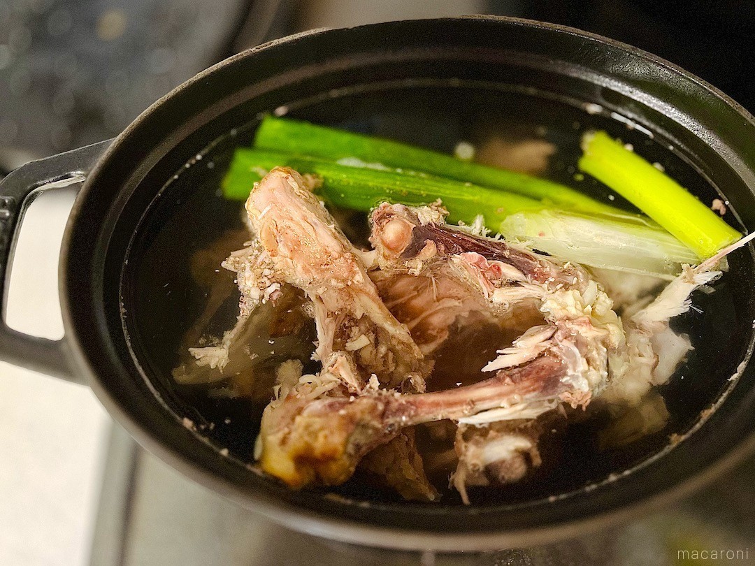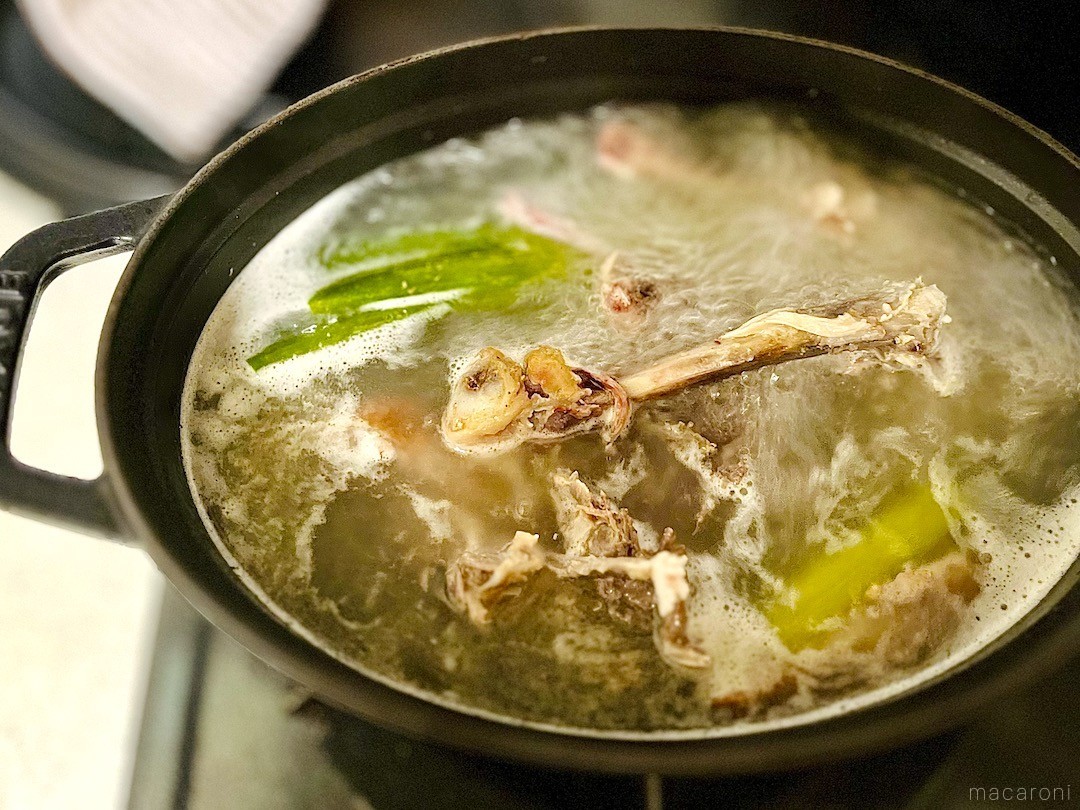アクを取ったあと1時間ほど煮込みます。沸騰させずに弱火でコトコト火を入れるとクリアな澄んだチキンスープに、骨を砕きながらグラグラと煮立てると白濁した鶏白湯のようなスープになりますよ。