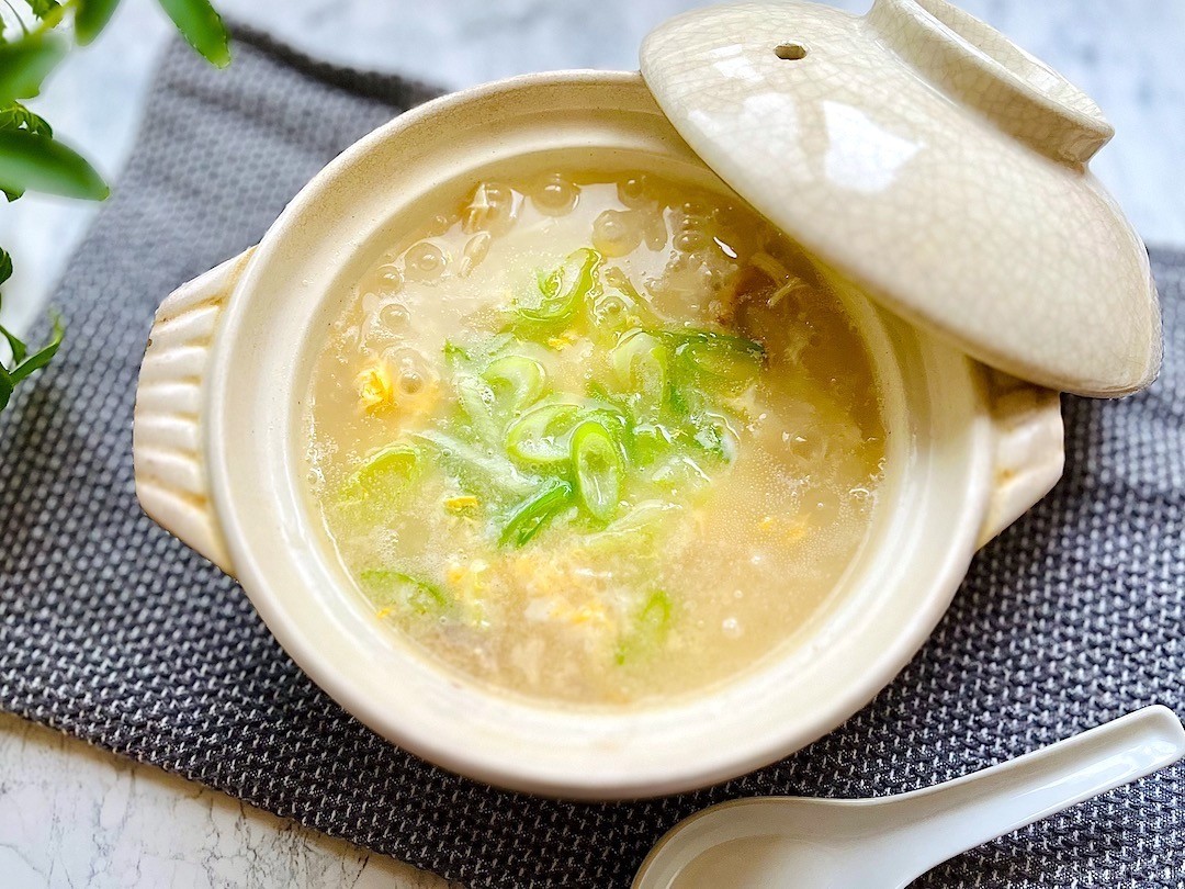 「ロティサリーチキン」のスープをお米にたっぷり吸わせた鶏雑炊。滋味深い鶏の旨みが体に染みわたるようでほっこりします。骨のまわりに残った小さな鶏肉がちょうどよい具材になりますよ。