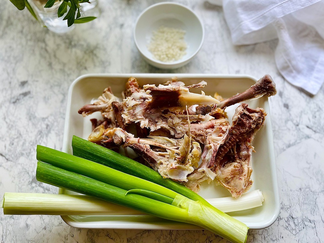 スープ作りのメイン食材は「ロティサリーチキン」の骨です。丸々とした身をおいしくいただいたら、残った骨を取り分けておくことをお忘れなく♪ チキンの切り方や骨の取り分け方は下記の記事を参考にしてくださいね。