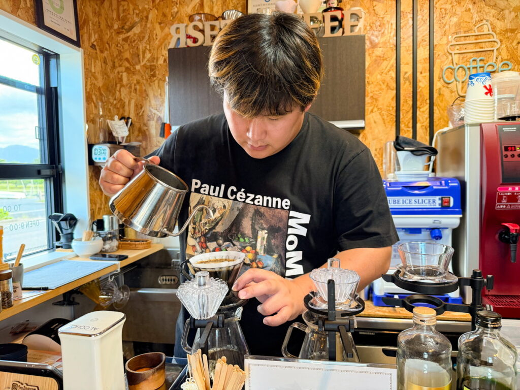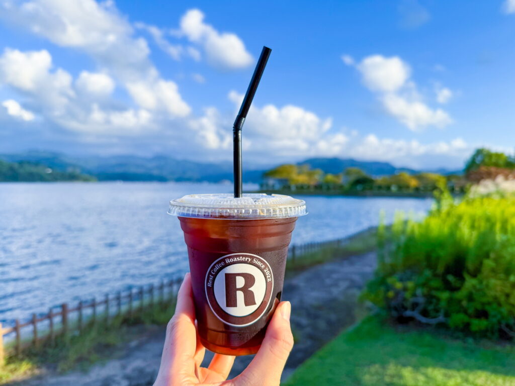 お店の道路向かいはすぐ東郷湖。湖岸には公園が広がっているので、コーヒーを片手に散策するとゆったりと時が流れるように感じて心地よいです。