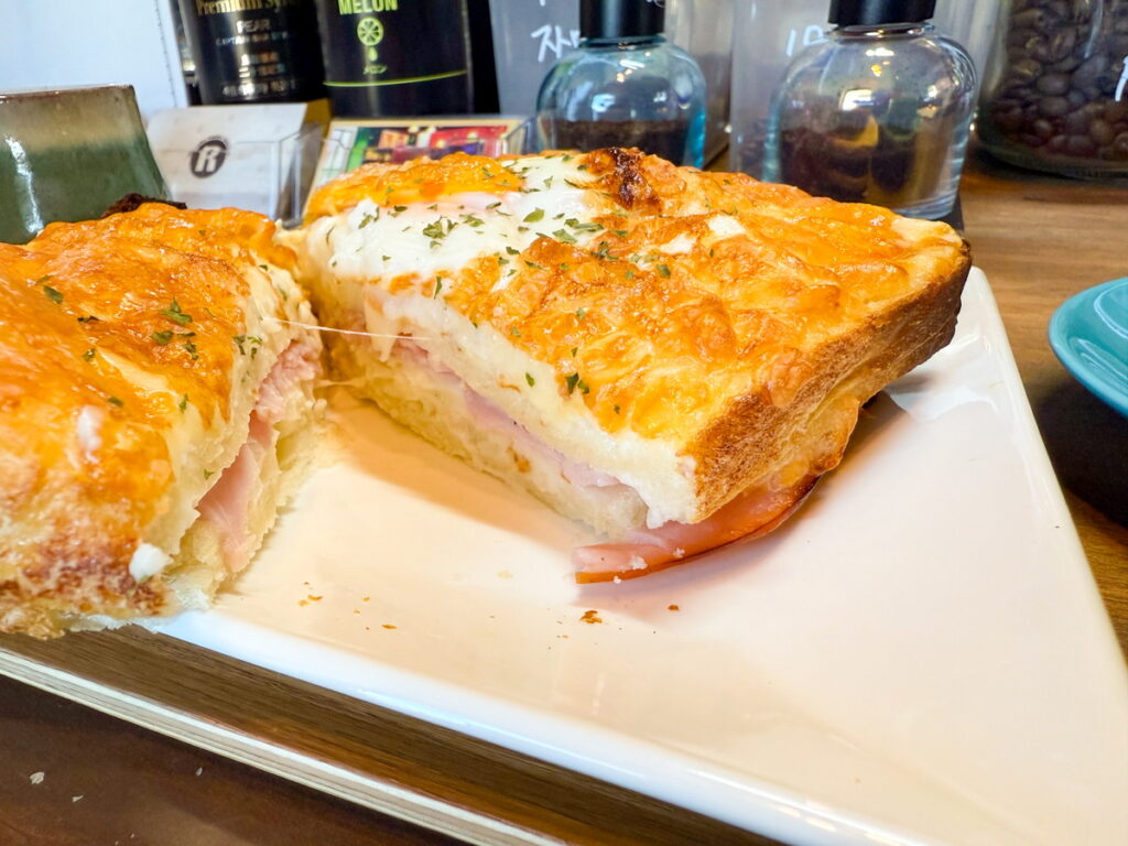 自家製ベシャメルソースとたっぷりのチーズを使い、湯梨浜町産の温泉たまごをトッピングしたクロックマダムは事前に予約してぜひ食べたい一品です。