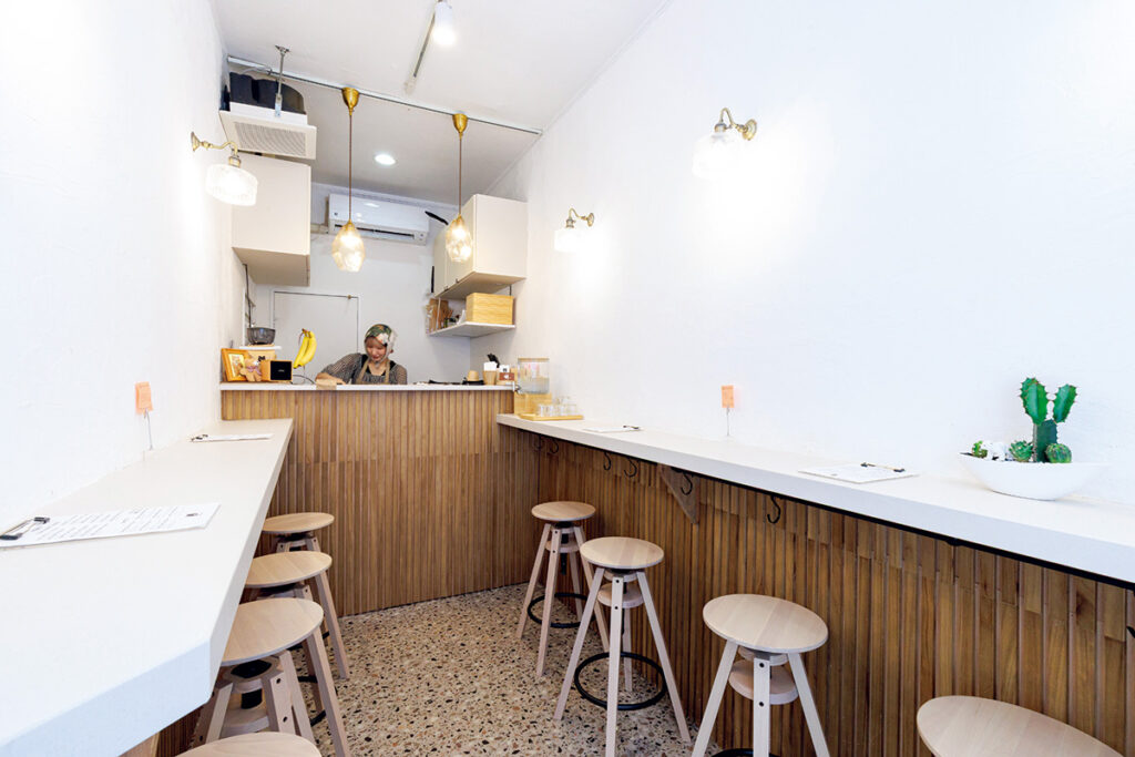 白を基調とした店内では、昼はゆったりとカフェメニューを、夜は立ち飲みスタイルでバータイムを楽しむことができますよ。