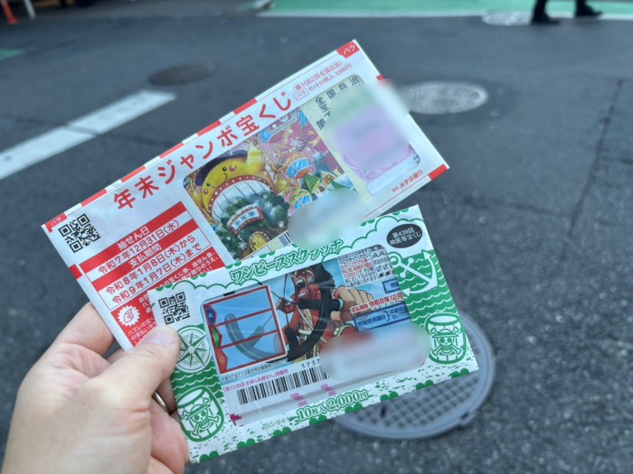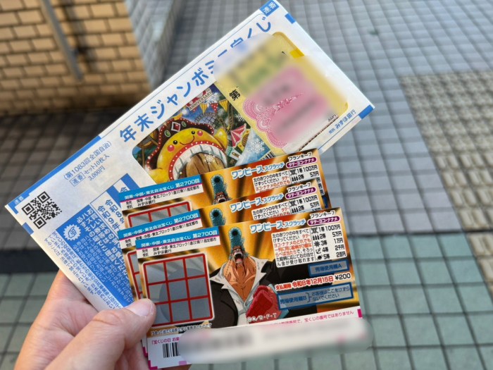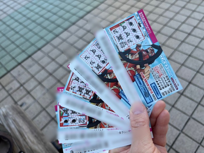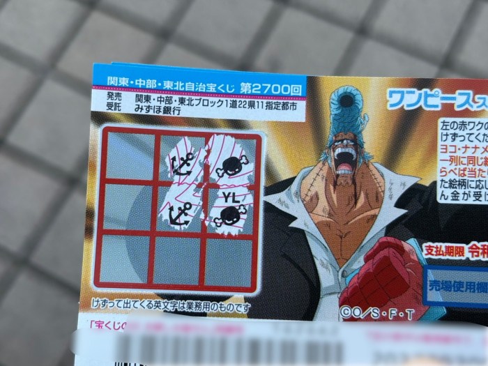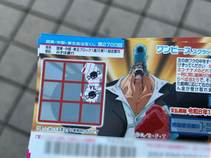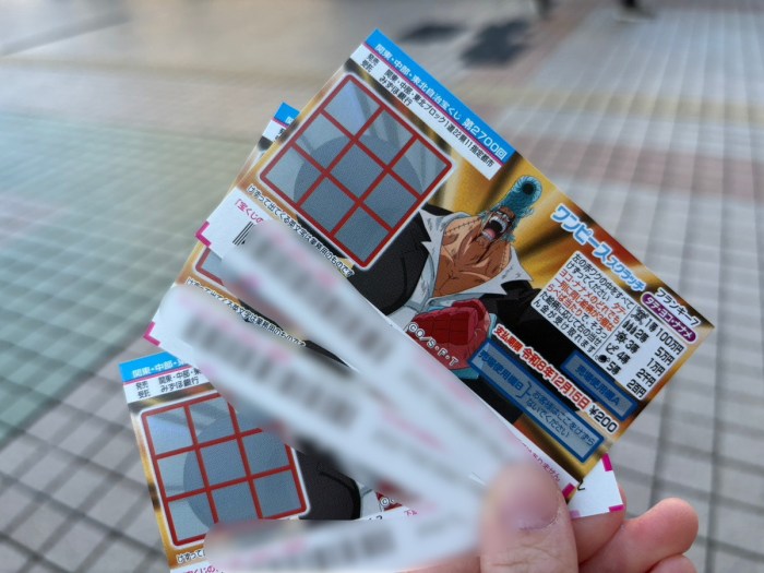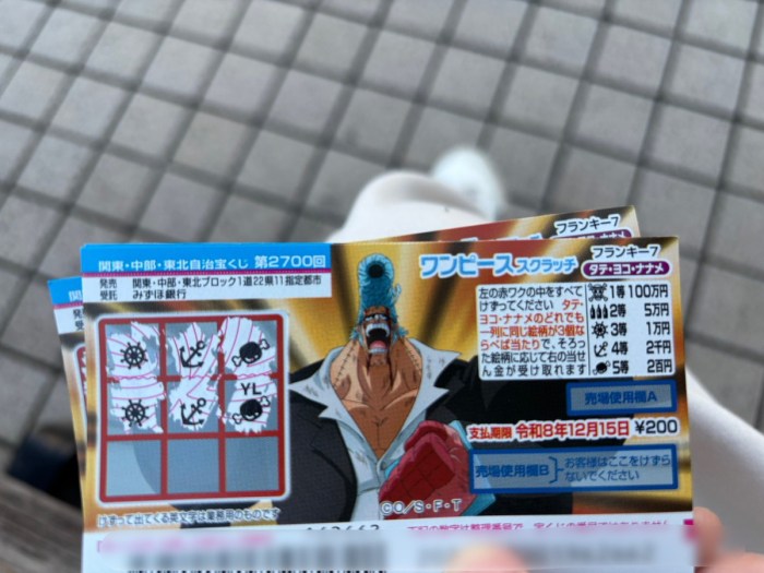 こちらでは、年末ジャンボミニ宝くじ連番10枚(3000円)と、さきほどとは違うワンピーススクラッチの「フランキー7 タテ・ヨコ・ナナメ」を3枚(600円)を購入。
