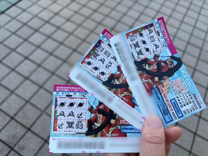 ワンピーススクラッチは10枚セット買えば、3枚以上が当たる仕様。最低当選額が200円なので、合計600円以上の当たりが出ていれば、まぁまぁ運がいいと言えるだろう。