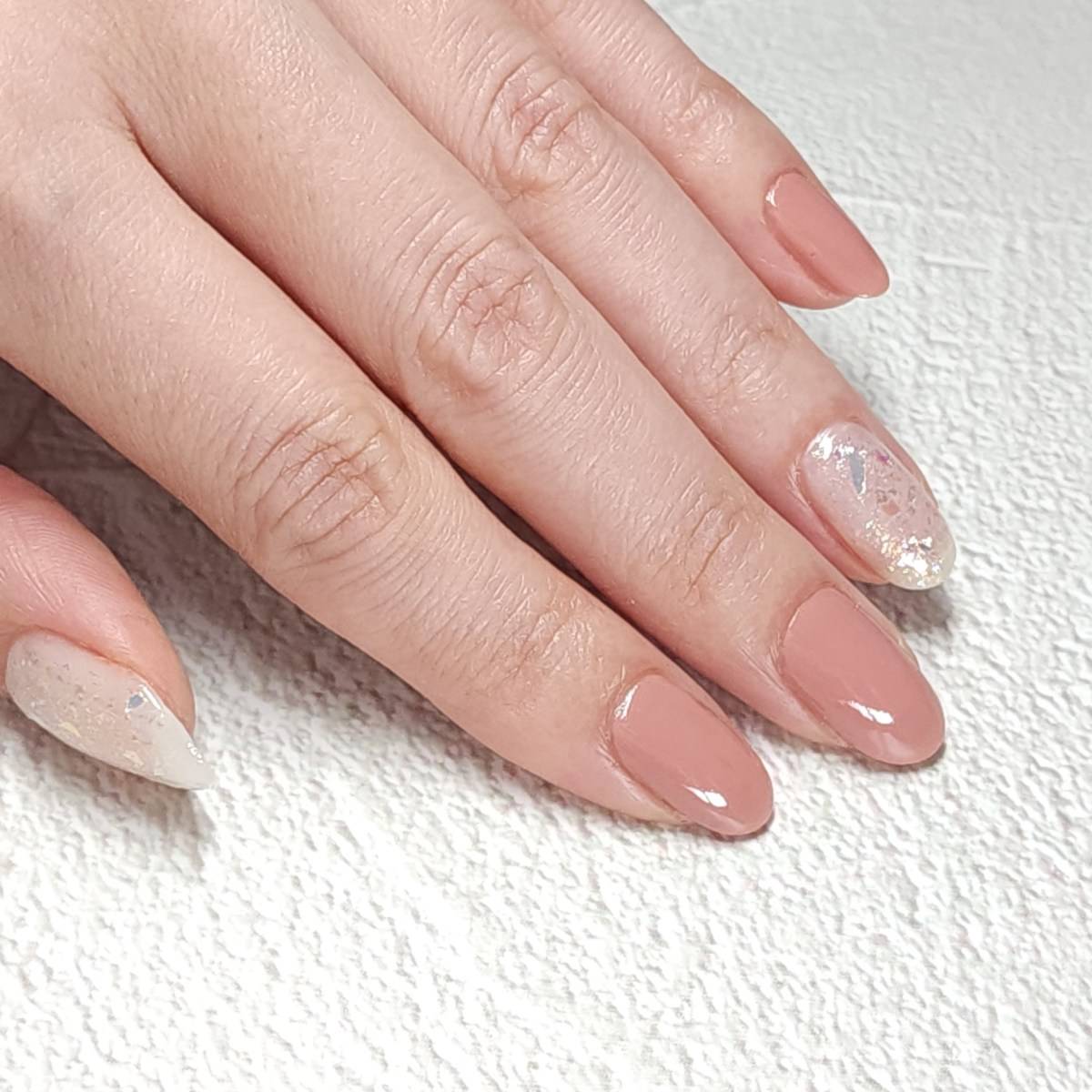 今回は、親指と薬指をオパールにするのでその2本は乳白色カラーを塗って、残りの3本はくすみピンクを塗っていきますね。