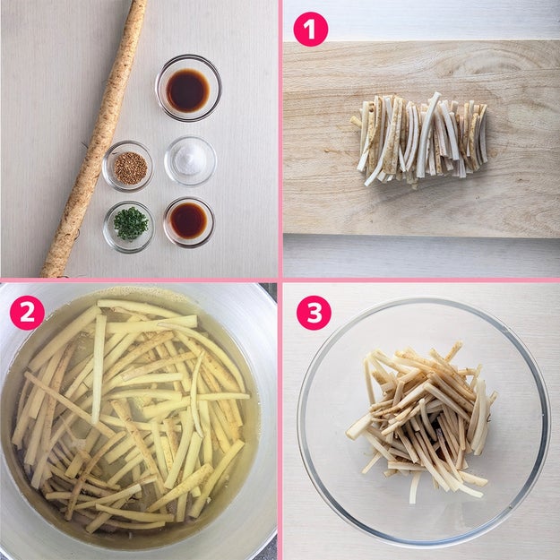 ① ごぼうはたわしでよく洗い、細切りにして水にさらし、あくを抜く。
