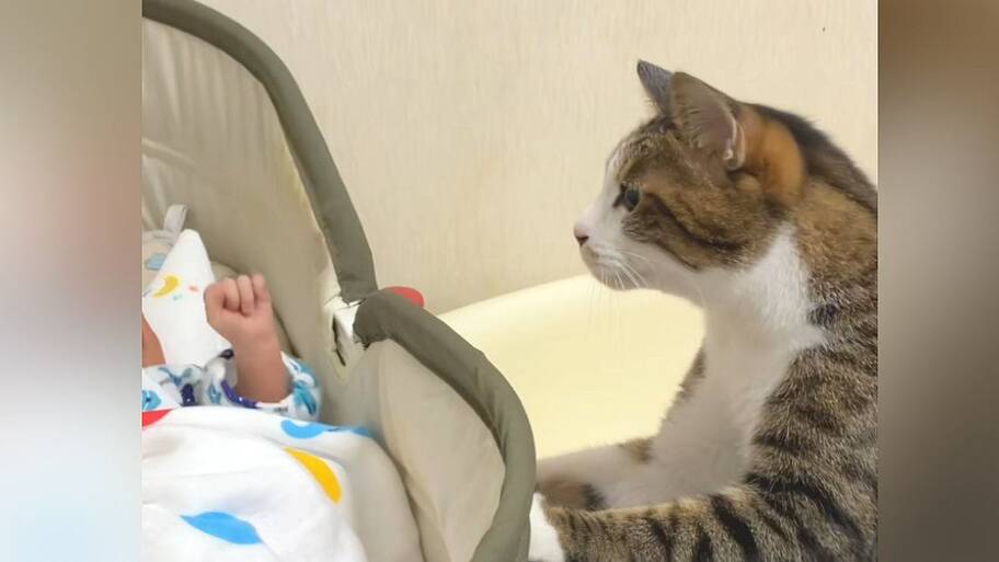 寝ている赤ちゃんのそばに『近寄ってきた猫』を見ていると…あまりにも尊すぎる瞬間が47万再生「一生見ていたい光景」「優しいね」