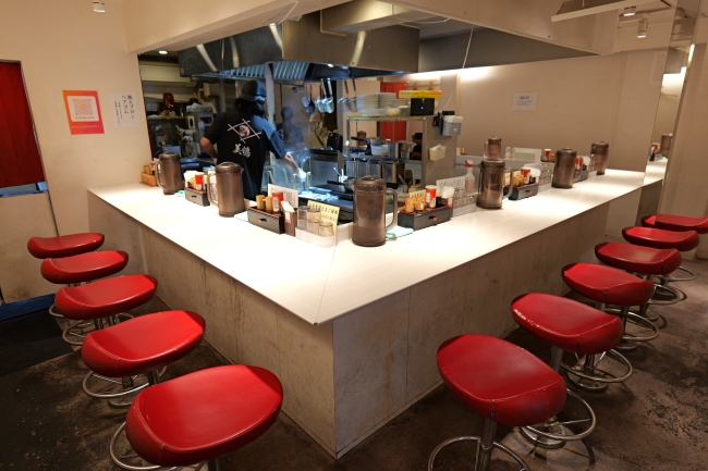 お店へのアクセスは阪急京都線・烏丸駅から徒歩約2分。店内はすべてカウンター席で、仕切りのある『味集中カウンター』が一蘭ならではの特徴。