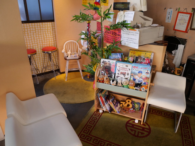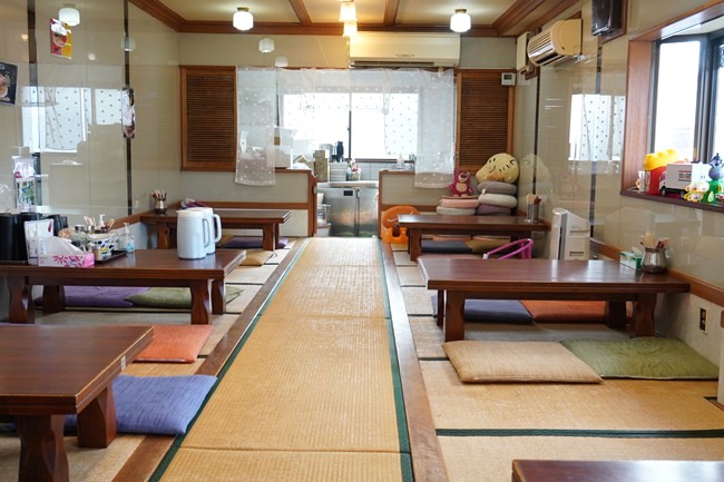 1階は、カウンター16席とテーブル席が1つあります。2階はテーブルが並ぶ座敷席で、子ども連れを優先して案内しているのだそう。子ども用食器の準備はもちろん、座敷席には椅子やクッション、たくさんのおもちゃが。おもちゃの数がとても多いので、「もっと遊びたい!」となる子どもも少なくないそうです。