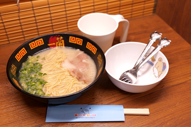 一蘭では、公式アプリの登録者限定で、小学生以下の子どもを対象に『お子様ラーメン』を無料で提供しています。専用のどんぶりで提供されるお子様ラーメンは、大人用のとんこつラーメンの半量サイズ。辛味のないマイルドなスープが特徴で、実際に大人用と比べてみると塩分が控えめであっさりとした味わいでした◎