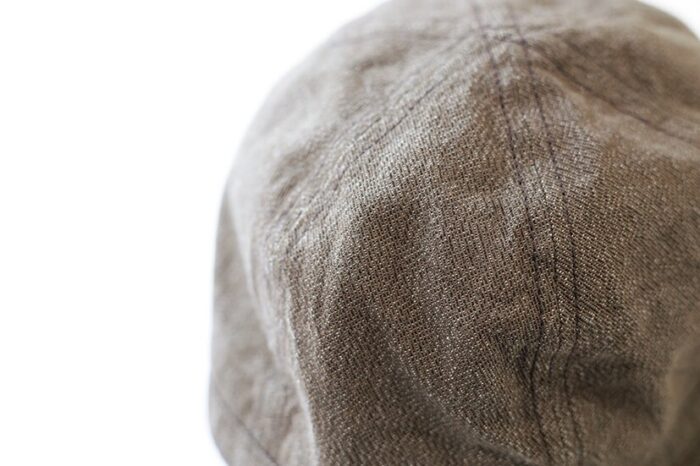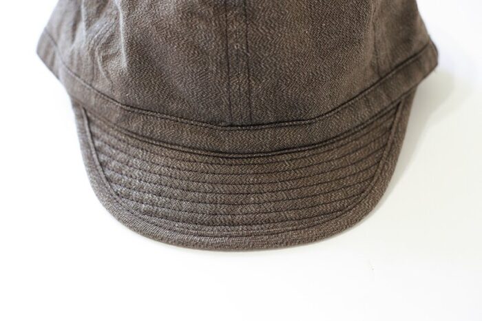 最初に断っておくと、実はこのキャップは、159ページに掲載する稲妻特派員用の謝礼として購入したんだけど、あまりにも気に入って自分用にも買ったもの。個人的には定番のブルーデニムだったら買わなかったんだけど、天邪鬼な性格からかブラウンデニムっていうのに強烈に惹かれた。聞けば、土埃などの汚れを目立たなくする効果を狙ったブラウンデニムはブルーデニム以前に作られたものらしく、ヴィンテージは現存数が極めて少ないためその存在すら知られていない希少なものだと言う。経糸に茶のナチュラルインディゴ、緯糸に生成りと黒の杢糸の淡いブラウンが、お気に入りだ。
