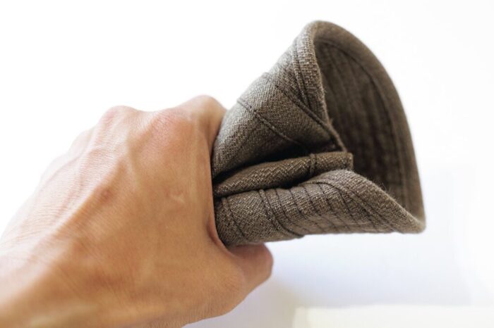 小さめのブリムには芯材が入っていないことで、くしゃっと丸めて携行することも可能。