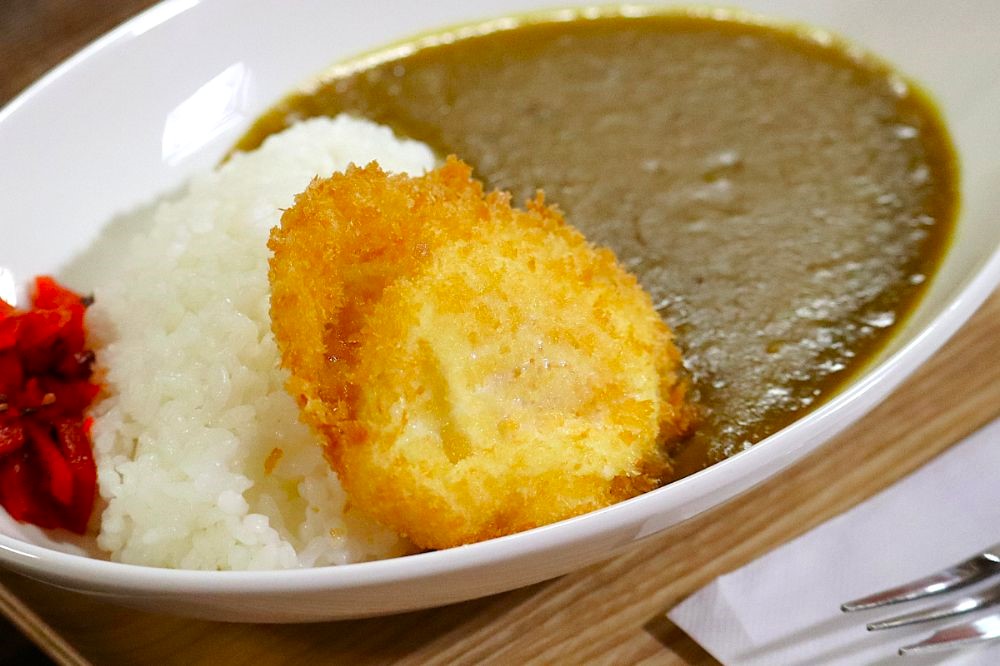 ランチにいただいたのは、地元・和歌山で昭和から親しまれてきた「バラカレー」。メニューの「龍王バラカレー」(880円/ミニサラダ付)に、今回はエッグフライ(+120円)をトッピングしました。