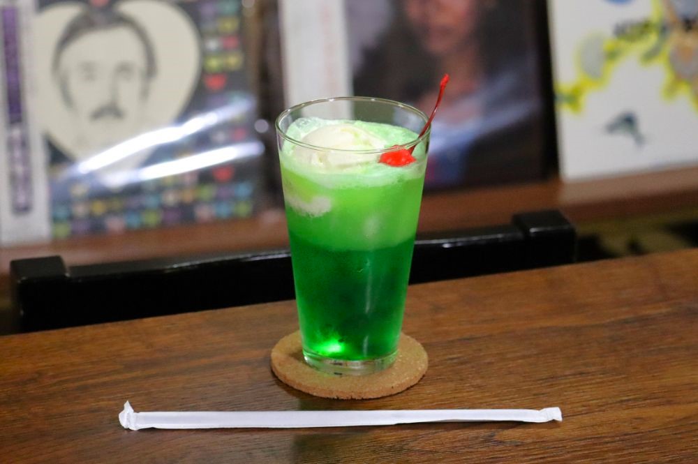 レコードいっぱいの室内を楽しむなら、昭和レトロの象徴ともいえる「クリームソーダ(メロン)」(600円)は欠かせません。シュワっと爽やかな炭酸にアイスが溶け出し、鮮やかな緑色がどこか懐かしい一杯です。