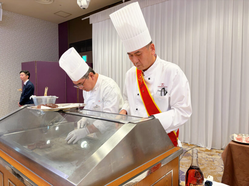 新潟会場はANAクラウンプラザホテル新潟をはじめ、ホテル日航新潟、ホテルオークラ新潟、新潟グランドホテル、ホテルイタリア軒の総料理長が集結。今回の試食会では、同ホテルの田村宏晃総料理長が「佐渡牛フィレ肉の鉄板焼き すずまさ農園ikkaプレミアムのミルフィーユ添え トリュフソース」と「越後バナーナのシブーストとアイスクリーム カカオの香りを添えて」を披露した。