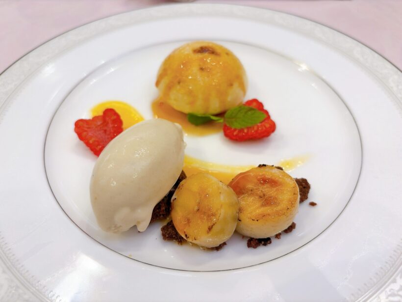 デザートには新潟で栽培される希少品種「グロスミッチェル」の越後バナーナを使用。ふわりとしたシブーストに濃厚なアイス、パリッとしたキャラメリゼを組み合わせ、絶妙な食感と香りを楽しめる一品となった。