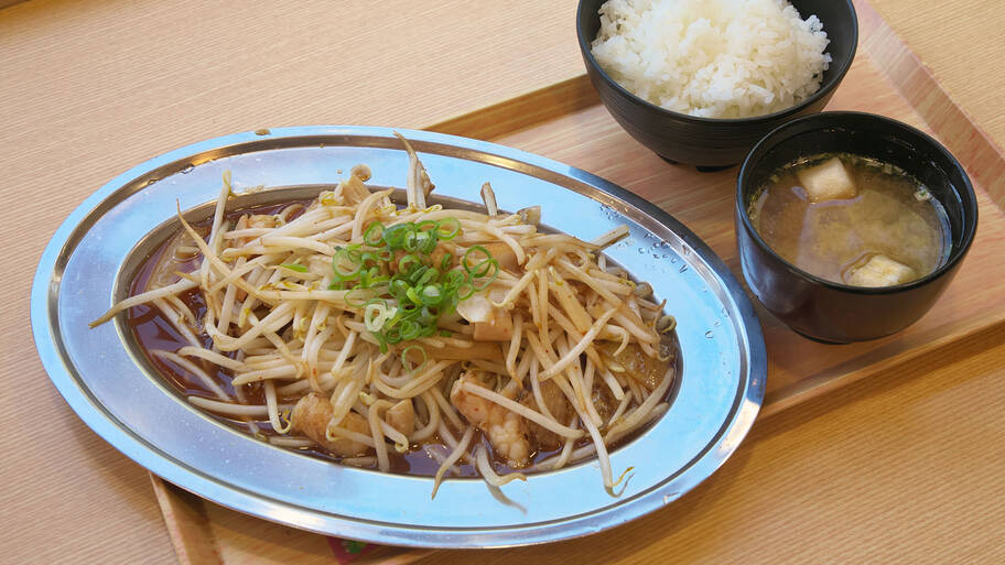 テーブルに運ばれてきた瞬間、まず目を引くのは、じゅわあっという音とともに、鉄板の上で湯気を立てる焼肉。香ばしく焼けた豚肉と玉ねぎが艶やかに輝き、ふわりと甘辛い香りが立ちのぼる。箸で持ち上げると、しっとりと柔らかく、噛むほどに肉のうま味が口の中で広がる。濃すぎない味付けで、ご飯との相性は抜群だ。