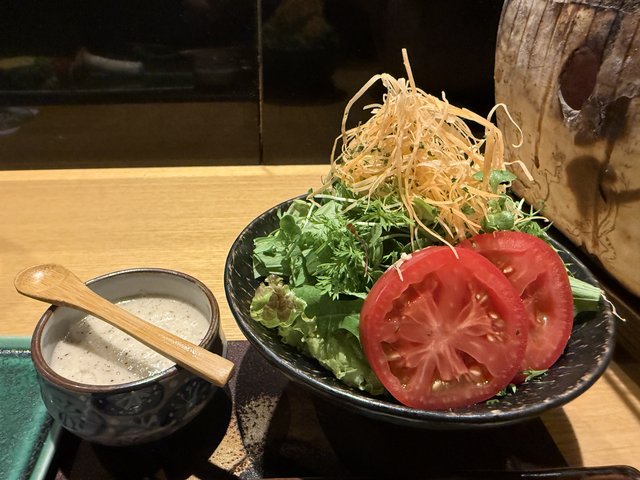 たっぷりのグリーンサラダも添えられ、玉ねぎドレッシングの旨みがアクセントに。