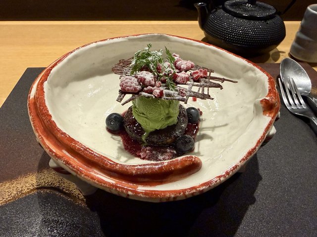 キャラメリゼしたイチジクにブランデーで香りづけし、抹茶アイスとチョコを添えた一品。