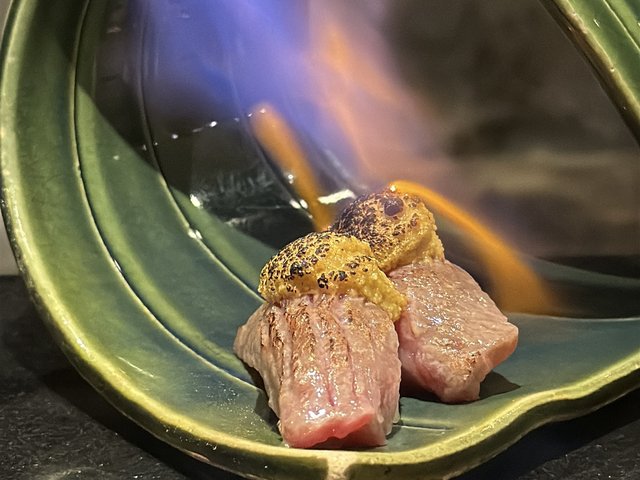 締めには、肉寿司に雲丹をのせて軽く炙ります。